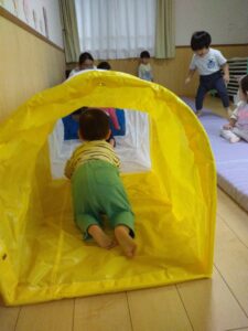 黄、白、青の3色のトンネルの中は外からの光を受けて不思議な空間となりちょっとした冒険に挑む武者のような気持になります。トンネルをくぐった後は横に敷いたマットの上をジャンプしながら移動し、また入口へと回り込みます。「黄色の方から入ろうね」と注意を促すと園児さんたちもきちんとルールを守って遊びました。