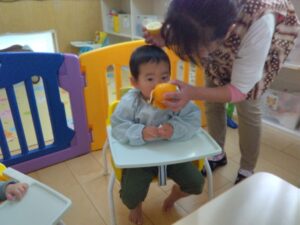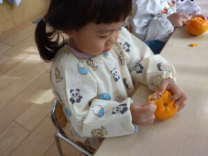 だんだん冬の様相になってきたのでこの季節のおいしい果物、みかんの食育をしました。園児さんたちの手に余るほどの大きいみかん、まずは半分に切ってにおいをかいでみます。オレンジ色をした半分のみかんからはみずみずしい香りがぱあっと広がります。みんな鼻をクンクンして嗅覚を研ぎ澄ませ一生懸命嗅ぎました。香りや色を楽しんだ後は自分で皮をむいていきます。初めての園児さんもいるのでせんせいが少しお手伝いをしたところもありましたが全員が上手に皮をむき、朝のおやつとして自分でむいたミカンをおいしそうにほおばりました。かなり大きなものでしたが自分でむけた達成感でしょうか、全員が完食しました。前回の食育はバナナだったのでむくのもスムーズでしたが少しハードルの上がったみかんも小さな手で器用にむいて子どもたちの成長をせんせいたちも嬉しく思ったひと時でした。
