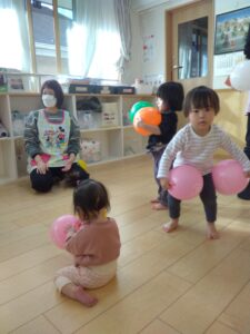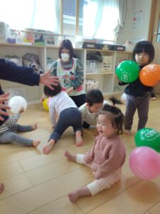 ピンク、白、緑、黄色、青など色とりどりの風船に子どもたちは大喜び。まるめろっじは0歳児から2歳児までの縦割り保育なのですが、風船ならばどんなに乱暴に扱ってもぶつかっても痛くない、怖くないで思う存分遊ぶことができました。外はこんなに寒いのに暴れまわったせいか大汗をかいて洋服を着替える子もいました。