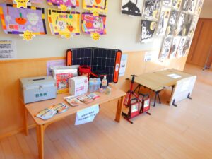 エントランスには園にある、防災グッズを展示しましたがご覧いただけたでしょうか。