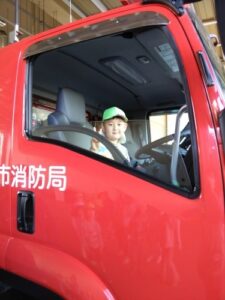 出張所では消防車(化学車)とブロアー車、そして隊員の皆さんが子どもたちを出迎えてくれました。予定では救急車も、という話でしたが残念ながら少し前に要請があり出動してしまったそうです。子どもたちは2グループに分かれて消防車とブロアー車の説明を聞きました。「火を消す水はどこから来るのか」「ホースのつなぎ方」「火事を消す時の服装」など子どもたちに分かり易く教えてくれました。ホースの先端ノズルの部分を持たせてもらったり、ボンベを背負わせてもらったり、ブロアー車には実際に乗車させてもらうことができました。初めて見るもの触るものが多く、子どもたちの目はキラキラ‼