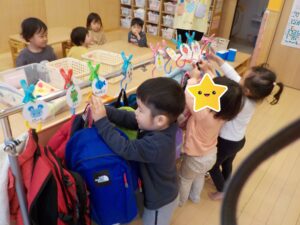 4月の進級を前に、少し早いのですが2歳児クラスの保護者の皆様にはリュックを用意していただき、慣れ親しんだクラスや先生たちと一緒に朝の支度を練習し始めました。
