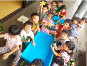 ハラン(葉蘭)の葉をご存じですか? 地表から大きな葉を伸ばす、スズラン亜科の植物です。今日はその大きな葉を使って 4歳児クラスが船を作り、水に浮かせて遊びました。緑色の鮮やかな葉を折りまずは「箱舟」を作りました。大きな容器に水を張り、作った船を実験感覚で浮かべて遊びました。静かに浮かぶ船や次第に沈んで行ってしまう船! 「どうして沈んでしまうのか?」子どもたちなりに考えたようです。