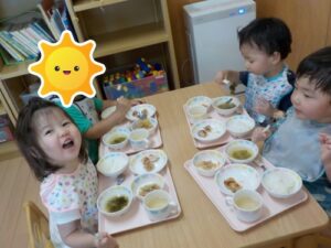 いただきまーす!上手に食具を使ってこぼさず食べられるようになってきました。